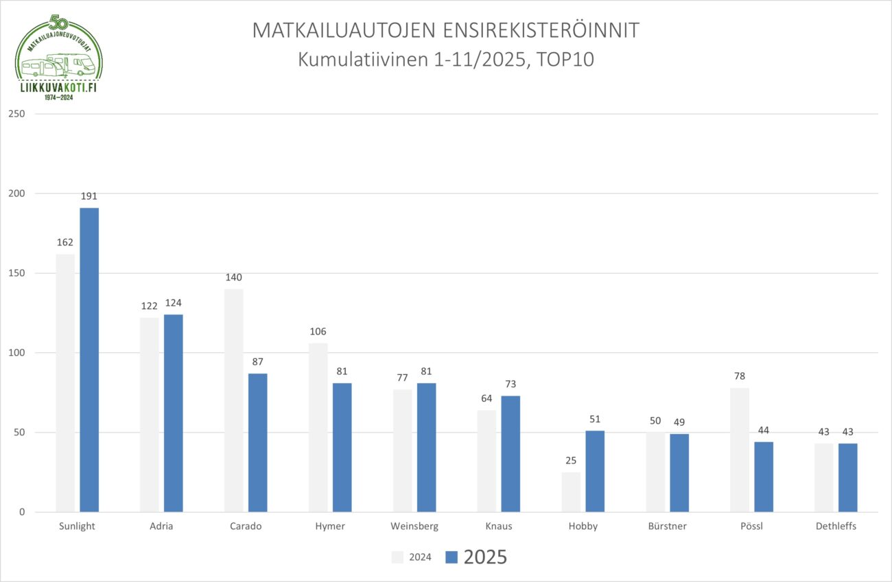 Vaikka vuoden sisäinen kehitys on ollut maltillista, kuukausitason luvut kertovat markkinan sopeutumiskyvystä. Matkailuautojen rekisteröintimäärä on kumulatiivisesti marraskuun loppuun mennessä vain hieman jäljessä edellisvuodesta (–14,02 %). Matkailuvaunujen vastaavia marraskuun lukuja voidaan pitää kohtalaisen tasaisina, niiden kumulatiivinen kehitys on –17,00 % vuoden takaiseen verrattuna.